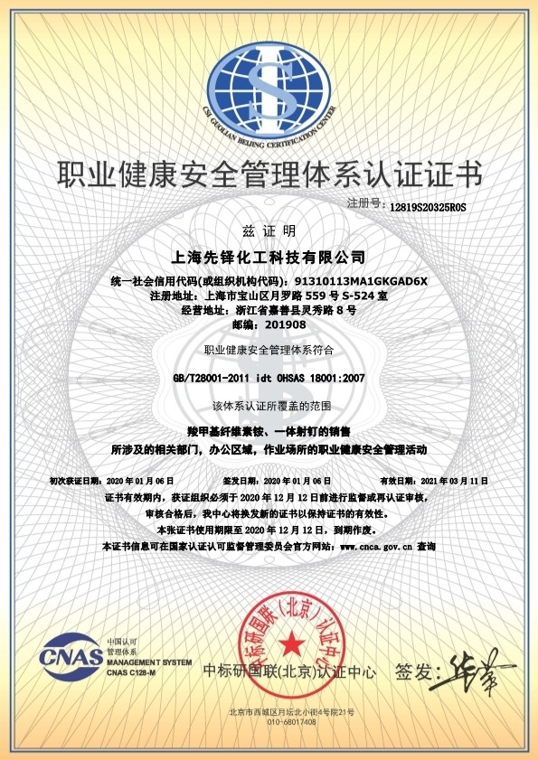 职业健康安全管理体系认证证书